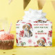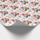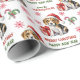 O padrão repetido neste papel de embrulho de Natal inclui uma imagem de um filhote adorável de Beagle vestindo um chapéu vermelho de Papai Noel com um pacote de presente de Natal ao seu lado. O texto vermelho e verde diz MERRY CHRISTMAS" e "Feliz ano novo" com sua assinatura personalizada abaixo. Outras imagens incluídas no padrão incluem flocos de neve decorativos vermelhos e canas doces.
