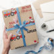 Um belo exemplo de um caminhão trator de Natal vermelho vestindo um chapéu de Papai Noel e decorado em luzes de Natal rebocando um vagão cheio de presentes de Natal em um fundo de papel marrom kraft. Perfeito para rapazes e raparigas que adoram tratores, caminhões, maquinaria pesada, agricultura ou que adoram brincar com caminhões de brinquedos. Um papel de embrulho de Natal ideal para os entusiastas de caminhões tratores grandes ou pequenos, raparigas ou rapazes. Personalize o nome e torne-o seu.