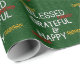 Paleta de cores de excelente em tons verdes, vermelhos e ouros com mensagem de texto branca de; "Abençoado, Grata e Feliz" tudo em um fundo verde de padrão tribal para um papel de embrulho de férias que é um pouco diferente de todo o resto.
