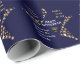 Na moda azul e ouro personalizados HAPPY HANUKKAH empacotando papel para desejar a sua família e amigos um Hanukkah feliz. A design mostra texto que diz HAPPY HANUKKAH em tipografia branca no centro, com PEACE, LOVE & JOY em tipografia dourada em um canto, e também escrito em HEBREW no outro canto. Isto é colocado sobre um fundo de estrelas douradas contra o azul-da-meia-noite. Este design está cheio de papel de embrulho. O texto do espaço reservado é personalizável, para que você possa criar sua própria saudação e adicionar seu(s) nome(s). Ideal para embrulhar seus presentes Chanukah. Outros cartões Chanucá, decoração domiciliar e presentes estão disponíveis na Coleção HANUKKAH por Designs Berean.