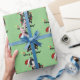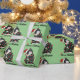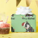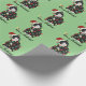 Este design bonitinho mostra um tuxedo preto e branco, vestindo um chapéu de Papai Noel e enredado em luzes de Natal, sobre um fundo verde-claro. No texto lê-se "Feliz Natal!" O presente perfeito para amantes de gatos.