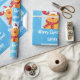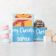 O presente de Natal moderno é embrulhado para crianças, com Rudolph a Reindeer, a saudação de "Feliz Natal" na tipografia da na moda, e um nome personalizado. Sobre um fundo azul com flocos de neve.