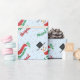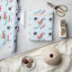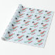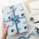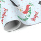 Este divertido papel de embrulho personalizável apresenta um boneco de neve aquoso, e cores tradicionais verdes e vermelhas na tipografia de script dizendo "Feliz Natal" (ou qualquer outra frase curta) e qualquer nome. O fundo é azul pálido e apresenta pequenos corações e espirais.