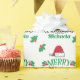 Este design de papel de embrulho bonito mostra um chapéu de Papai Noel acima de uma mensagem de Natal feliz que pode ser personalizada com o nome do seu filho. Ao redor do texto estão bonitinhos e doces.