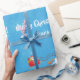O presente de Natal moderno para as crianças, com um unicórnio (com homem e conto com brilho vermelho e ouro) puxando Papais noeis para trenó; a saudação "Feliz Natal" na tipografia na moda; e um nome personalizado. Sobre um fundo azul com flocos de neve.