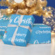 Um presente de Natal moderno com as palavras "Feliz Natal" na tipografia da na moda, flocos de neve, uma ilustração de um unicórnio (com um homem e uma cauda com brilho vermelho e ouro) puxando Papais noeis no seu trenó, e uma árvore de Natal. Sobre um fundo azul com flocos de neve. Observe que você pode personalizar a saudação menor com o nome de uma criança.