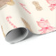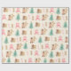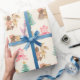 O primeiro papel de embrulho de presente de Natal de uma menina, com árvore de Natal pintada a aquarelas, blocos com letras, bonecas de vintage, ursos de pelúcia vermelha e canas doces num conjunto de três folhas da mesma imagem.