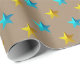 Um papel festivo de embrulho para a época de Natal, com estrelas azul-turquesa e douradas sobre fundo de papel kraft rústico. Excelente para qualquer ocasião e faz um embrulho de presente impressionante.