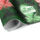 Arte Steampunk em papel de embrulho para as férias. Um padrão antigo de arte vitoriana de balão é tratado de forma festiva com cores verdes e vermelhas de férias, com uma saudação de FÉRIAS FELIZES. O fundo é uma cor damasco suave para aquela sensação realmente vintage.