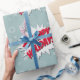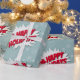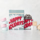 ilustração do estilo gibi Feliz Feriados com a campainha de Natal e a decoração dos flocos de neve em fundo azul