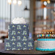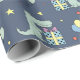 Crocodilo verde sobre as pernas traseiras segurando um belo presente embrulhado e segurando uma corda de balões amarelos e azuis. Estrelas amarelas, triângulos e pontos vermelhos também sobre um fundo azul escuro.