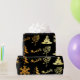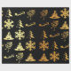O papel de papel de embrulho luxuoso com figuras douradas do Natal do falso pequeno, como a árvore de Natal, neva floco, sinos, uma vela e papai noel em seu trenó em um fundo preto.
