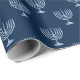 Aqui temos um papel de embrulho que apresenta uma menorah de filigrana metálica sobre um fundo azul escuro. Este documento está disponível em vários tamanhos e corresponde a outros papéis de embalagem, papéis de tecidos, sacos de presentes e um cartão de saudação. Isso certamente fará uma adição perfeita aos seus presentes nesta temporada de festas.