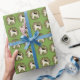 Estilo de desenho animado Fio Fox Terrier cão contra um fundo de coroa escura verde de Natal com realces de morango vermelho. Procure os suprimentos de presentes correspondentes: papel de prenda, papel de tecido, fitas, sacos de presente e caixas de presentes.