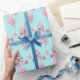 Um Flamingo de Natal em design de cinta rosa e azul giro. Pastel Blue com um flamingo cor-de-rosa num chapéu cor-de-rosa e bolhas cor-de-rosa decoram o papel de embalagem personalizado.