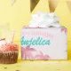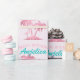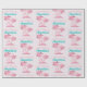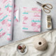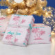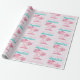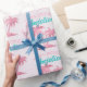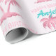 Este papel de embrulho de presente personalizado apresenta um tema cor-de-rosa flamingo. A imagem mostra um flamingo por baixo de uma palmeira numa ilha tropical. A imagem tem um padrão de folha cor-de-rosa glamouroso com sotaques reluzentes. Um exemplo de saudação de "Parabéns" é impresso em uma bonito cor-de-rosa borbllegum, com um nome personalizado impresso em uma fonte de cor rosa vintage.