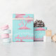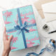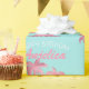 Este papel de embrulho de presente personalizado apresenta um tema cor-de-rosa flamingo em um fundo teal. A imagem mostra um flamingo por baixo de uma palmeira numa ilha tropical. A imagem tem um padrão de folha cor-de-rosa glamouroso com sotaques reluzentes. Um exemplo de saudação de "Parabéns" é impresso em uma cor rosa borblegum bonito, com um nome personalizado impresso em uma fonte de script rosa.