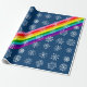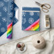 Embalagem de presente muito legal em azul profundo da meia-noite coberto em flocos de neve brancos e com uma faixa de cores do arco-íris.