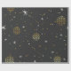 Lindos flocos brancos de neve e estrelas douradas, bolinhas e bolas sobre fundo preto. Modelo de papel de embalagem personalizável