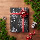 Um elegante design de papel de embrulho de Natal com flocos de neve brancos e estrelas colocadas sobre um fundo preto.