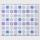 Este papel de embrulho tem um design de inverno com diferentes flocos de neve em blues e roxas em filas.