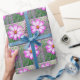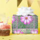 Uma flor rosa brilhante e branca do cosmos se destaca em relação a um fundo de elos de cadeia desfocados