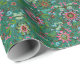 Um impressão floral e rolante derivado de um vaso antigo. Feito em cores verde, rosa, azul e âmbar. Papel de embalagem muito bonito