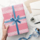 Este artigo personalizado é tão bonito em um padrão listrado rosa e branco.
