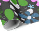 Flores azuis, verdes e cor-de-rosa, cor-de-rosa, com bolinhas brancas em papel de enrolamento preto.