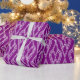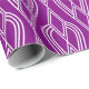 Este papel de embrulho tem um design de diamantes Art Deco conectado por linhas curvas em branco num campo de roxo.