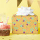 Este papel de embrulho apresenta um design abstrato que se parece com as mãos pegajosas com as quais todos brincamos quando crianças. Os designs pegajosos também podem ser flores, dependendo do seu ponto de vista! De qualquer forma, esses designs divertidos são roxos e aqua e são colocados em um fundo laranja com pontos e conjuntos de listras.