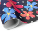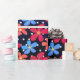Flores laranja, vermelha e margarida azul em um padrão de bolinhas.