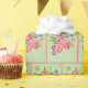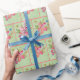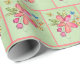 Flores cor-de-água rosa em verde com borboletas amarelas e azuis.