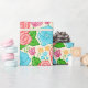 Flores rosas e azuis, bonitas, com folhas verdes. Modelo de papel de embalagem personalizável