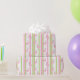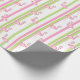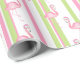 This wrapping paper features a pink flamingo wearing a Santa hat with a pink and green striped background.