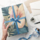 Papel de embalagem tropical vibrante com padrões florais cor-de-rosa e verdes com folhas de palma havaianas. Perfeito para presentes de aniversário, festas de verão e comemorações de primavera.