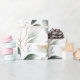 Papel belo e elegante de embrulho verde com eucalipto e verde misturado sobre fundo branco limpo. Sugestões de videiras de ouro falsas e salpicos tornam isto elegante para qualquer presente.