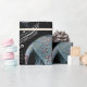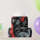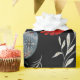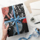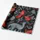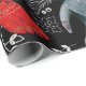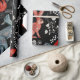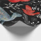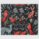 Illustrated black background features patterned red and blue birds, a rabbit, and a deer among white floral designs, creating a whimsical, folk-art style.