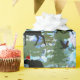 Moose, elk, bear and crows wearing Santa hats to ring in the holiday season. Evergreen trees and snowflakes complete the festive winter scene. By Melissa J Barrett