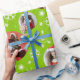 Flocos de neve divertidos e fotos redondas da família de Natal embrulhando papel de presente em verde-claro e branco. Personalize com três das suas próprias fotos especiais. Desenvolvido exclusivamente pela Sarah Trett.