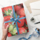 Papel de embrulho com uma fotografia colorida que inclui um monte de morangos vermelhos e lúcidos.