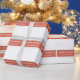 Papel de embrulho de férias moderno com sua foto favorita do seu bebê de pele, "Feliz Natal", nome da família em caracteres serif modernos sobre fundo vermelho festivo
