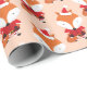 Diversão, Natal, papel de embrulho com raposas em roupas de Papai noel, incluindo o chapéu em fundo laranja claro. Adicione este papel de embrulho ao seu presente de Natal e tenha um Feliz Natal.