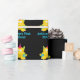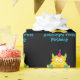 Um pequeno monstro amarelo colorido é definido em qualquer cor de fundo na sombra que você preferir. O padrão é definido como preto, mas pode ser alterado. Personalize com o nome do aniversário da criança.