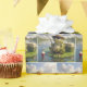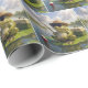 A frog wearing sunglasses and a straw hat sits on a lily pad in a lake, holding a fishing rod with a tackle box beside him