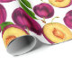 belo papel de embalagem roxo e verde, com pêssego maduro e folhas em fundo branco.
