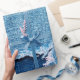 Fundo de denim texturizado. Furo no tecido. Tons azuis