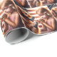 Uma jovem e um recuperador de ouros ficam lado a lado, com os olhos fechados e as mãos/patas juntas num gesto de oração no pano de fundo de uma bandeira americana