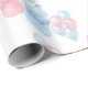Este papel de embalagem de presente revelado por gênero de bebê apresenta um tema de cor rosa e azul-pastel giro. Uma garrafa de bebê cor-de-rosa é colocada à esquerda com "garota?" impressa em uma letra elegante. Coloca-se à direita uma garrafa de bebê de cor azul macia com "rapaz?" impresso sobre cima. Os balões cor-de-rosa e azuis soam as bordas.