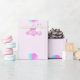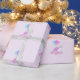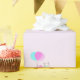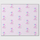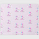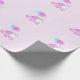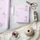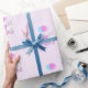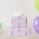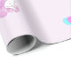 Papel de embrulho com um gato branco giro, com olhos turquesa sentados num carro cor-de-rosa, cheio de caixas-prenda roxas e cor-de-rosa, roxas e turquesas. O design é personalizável.
